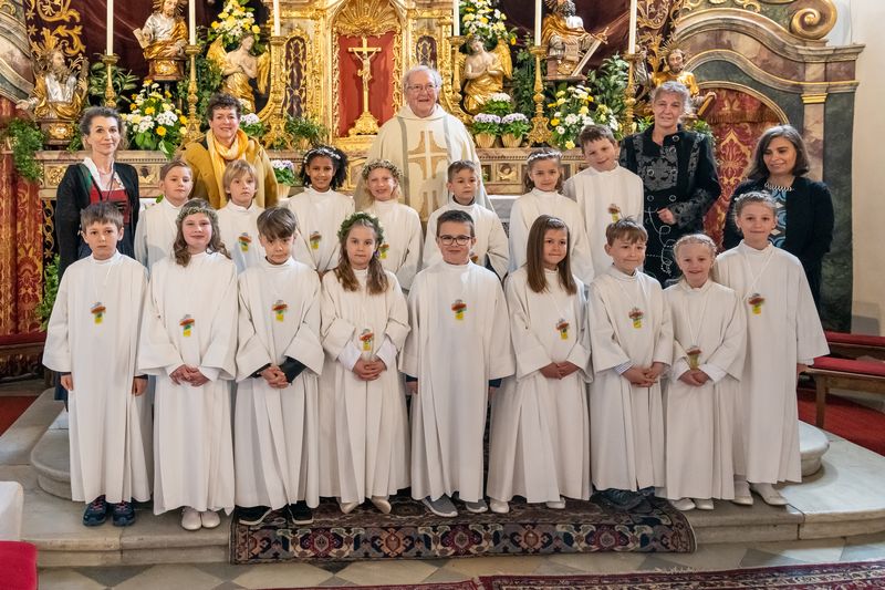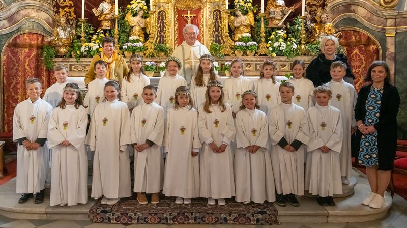Am Weißen Sonntag konnten die Erstkommunionkinder der Klassen 2a und 2b gemeinsam mit Vikar Sepp, ihren Lehrerinnen und Eltern ihr ganz besonderes Fest feiern!