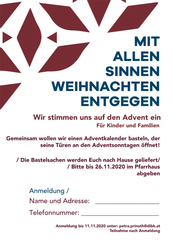 Gebastelt wird daheim mit den Kindern in den Familien. Das Bastelmaterial wird nach Hause geliefert mit den genauen Erklärungen und Anleitungen. Abzugeben sind die fertigen Basteleien bis 26.11.2020 im Pfarrhaus. Ihr findet sie im Adventkalender wieder!